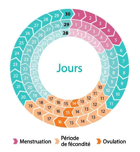 Le cycle menstruel commence avec le premier jour des menstruations et se termine juste avant les prochaines. Il dure généralement de 28 à 32 jours, mais cette durée peut varier. Environ 14 jours avant le prochain cycle, les ovaires libèrent un ovule qui voyage ensuite dans une trompe de Fallope en direction de l’utérus.